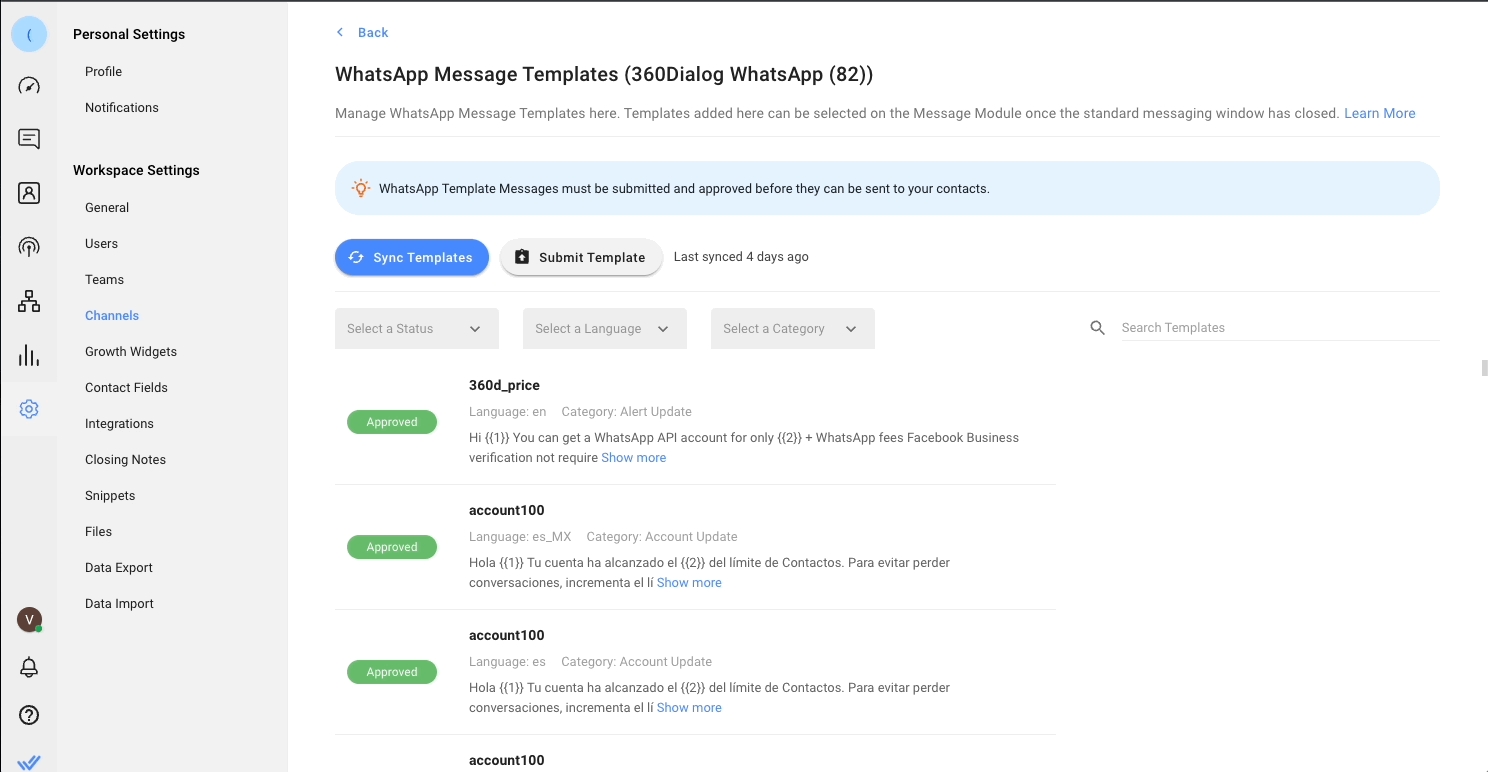 ¡Encontrar la plantilla de WhatsApp adecuada ahora es más fácil! Hemos agregado filtros para idiomas y categorías al Administrador de plantillas de WhatsApp y ahora puedes obtener una vista previa de las plantillas, incluidos los encabezados y pies de página, no solo su contenido.