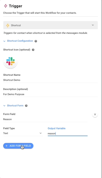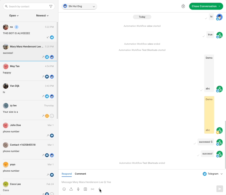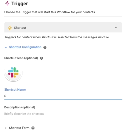Un acceso directo es un flujo de trabajo que se ha creado con el desencadenador de acceso directo recién introducido. Se puede iniciar en los módulos de Mensajes, lo que permite a los usuarios de la plataforma iniciar flujos de trabajo durante las conversaciones con los contactos sin salir del módulo.