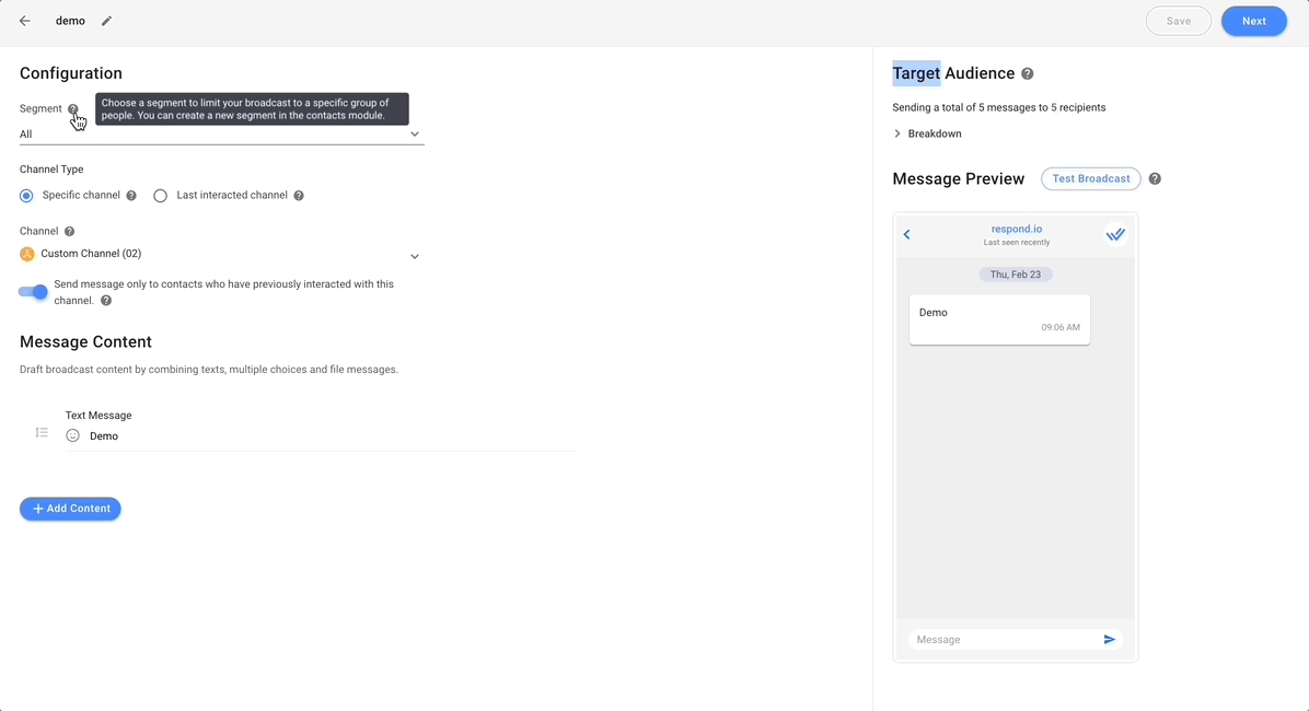 La característica destacada del módulo de difusiones renovado es el segmento de contacto, que le permite crear segmentos basados en campos de contacto, etiquetas o condiciones. Esta nueva capacidad le permite definir de manera fácil y precisa una audiencia objetivo para cada transmisión.
