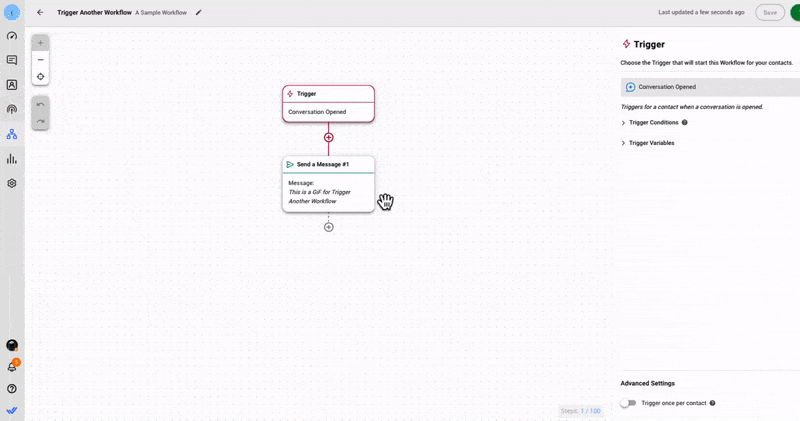 En el pasado, no era posible iniciar un flujo de trabajo dentro de otro flujo de trabajo. Como solución alternativa, los usuarios de Okeybot tuvieron que crear flujos de trabajo complejos de varios pasos para lograr el recorrido deseado del cliente, lo que dificultó la experiencia del usuario.