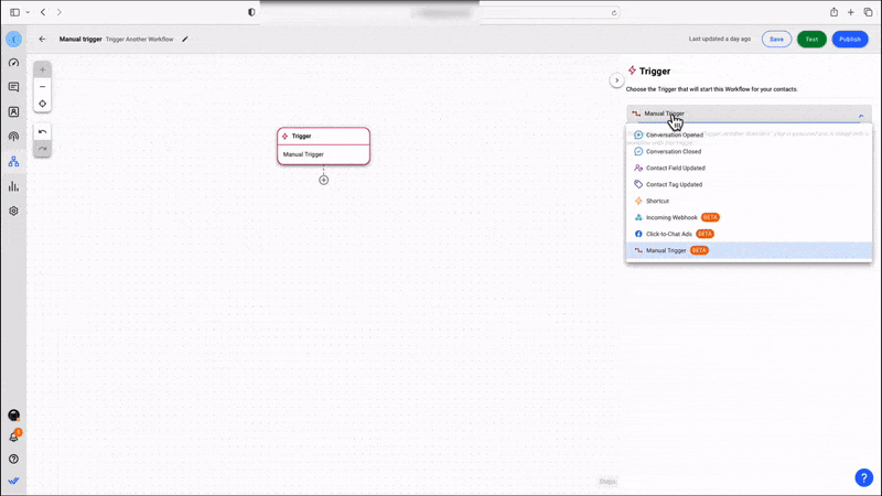 El Disparador manual funciona de manera muy diferente a otros disparadores, ya que no tiene un evento intrínseco que lo active por sí solo. Su función es darle al flujo de trabajo secundario un punto de entrada al flujo de trabajo principal.