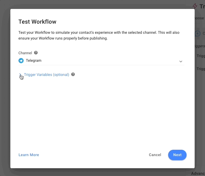 Si ha configurado alguna variable desencadenante en su flujo de trabajo, puede proporcionar un valor ficticio para probar su flujo de trabajo. Si no se proporcionan valores ficticios, el valor se tratará como nulo.