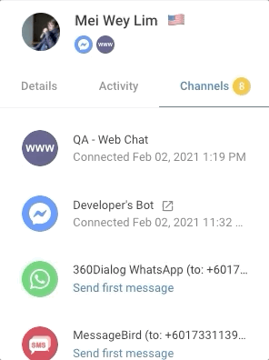 Pestaña nuevos canales Aquí es donde puede encontrar todos los canales activos, inactivos y restringidos de un contacto. Puede iniciar una conversación con su contacto a través del canal inactivo haciendo clic en el "Enviar el primer mensaje". En la parte inferior de esta sección, también encontrará una lista de contactos que se sugiere fusionar según la relevancia del número de teléfono y la dirección de correo electrónico.
