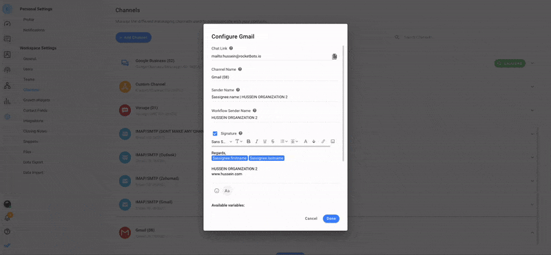 Además, tiene la posibilidad de incluir una imagen y personalizar su firma utilizando nuestro editor de texto enriquecido para crear el formato que desee. De forma predeterminada, esta firma se aplicará a los clientes que se conecten a un nuevo canal de correo electrónico. Para los usuarios existentes, su configuración anterior permanecerá vigente hasta que modifique sus configuraciones.