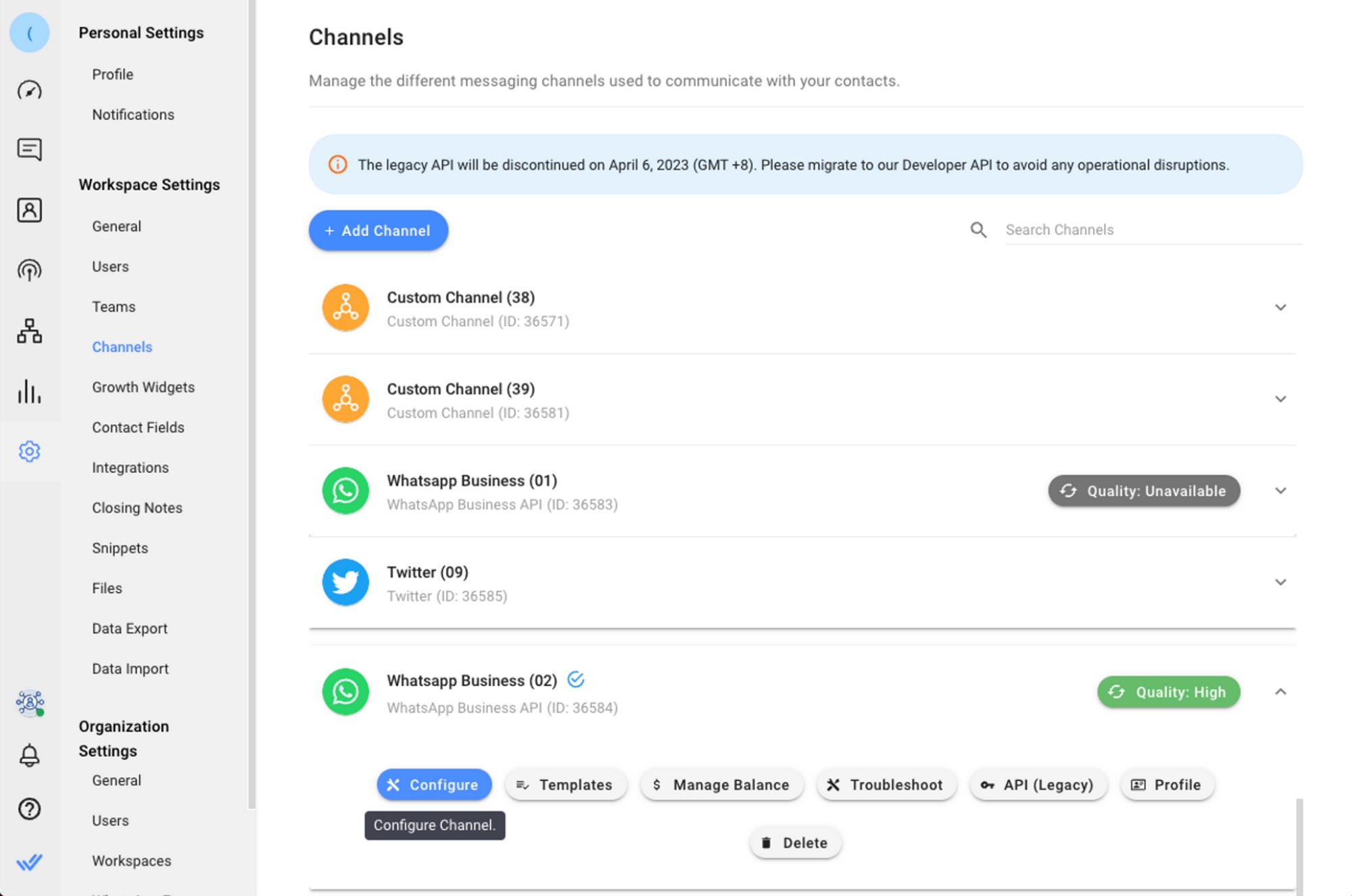 Paso 2: Navegue a Configuración de canal Ubique el canal API de WhatsApp Business > Haga clic en Configurar.