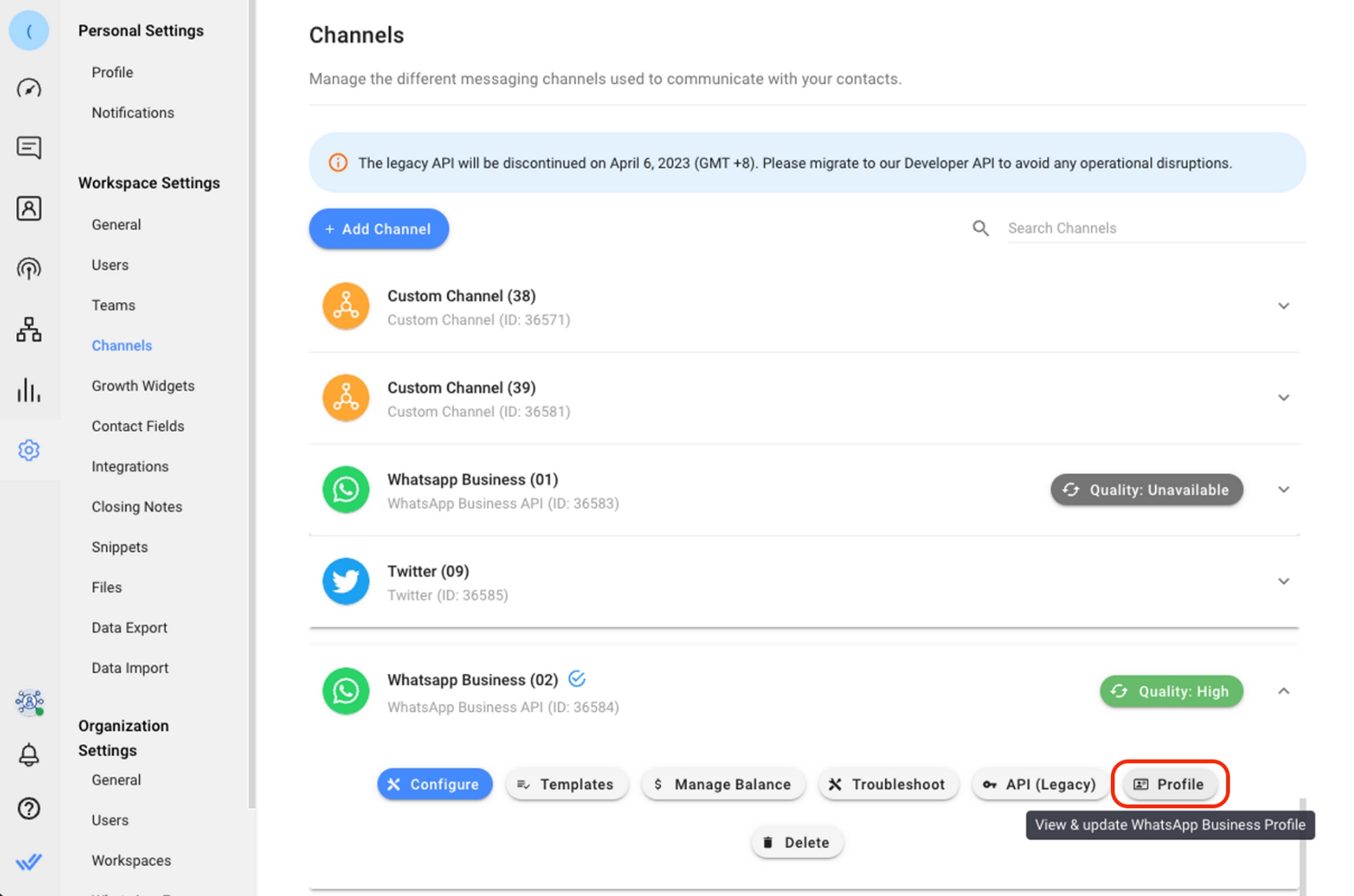 Paso 2: Navegue hasta Perfil Ubique el canal API de WhatsApp Business > Haga clic en Perfil.