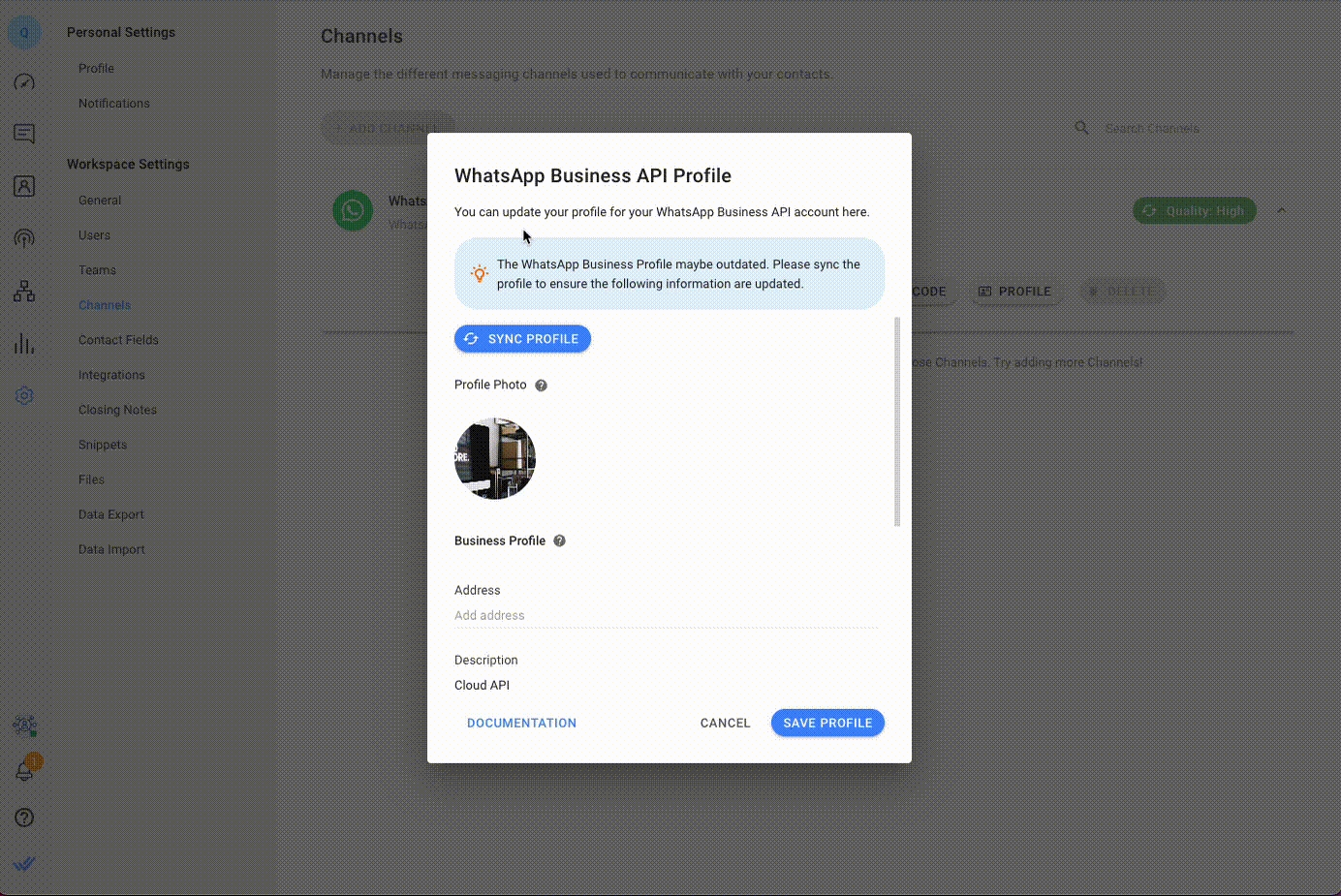 Paso 3: Sincronizar perfil Si el perfil no se ha sincronizado, haga clic en Sincronizar perfil para obtener la información más reciente del perfil comercial de WhatsApp de WhatsApp.