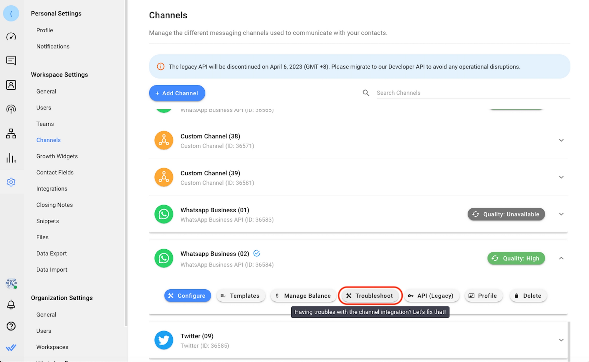 Paso 1: Localizar el canal de WhatsApp Business API Navegue al módulo Configuración > haga clic en Canales > busque el canal WhatsApp Business API Messenger > haga clic en Solucionar problemas.