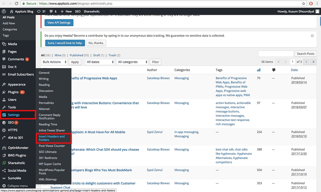 En el menú de navegación de la izquierda, haga clic en Configuración y seleccione el plugin Insertar encabezados y pies de página en el submenú de configuración.