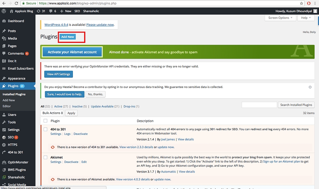 Desde el panel de navegación izquierdo, haga clic en Plugin . En la página de plugins, presione el botón azul Agregar nuevo en la parte superior de la página .
