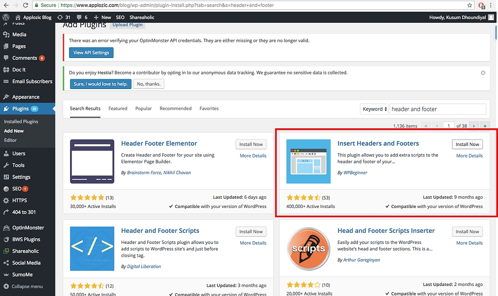 Con la barra de búsqueda, busque el complemento Insertar encabezado y pie de página . Verá muchas opciones en la página de resultados de búsqueda que puede usar, pero usaremos el plugin "Insertar encabezado y pie de página" de WPBeginner para este tutorial. Presione el botón Instalar ahora y asegúrese de activar el complemento para utilizarlo.