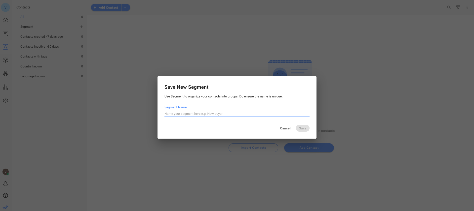 Paso 1: Localice Agregar segmento En su espacio de trabajo, vaya a Contactos > haga clic en el botón + Agregar segmento.