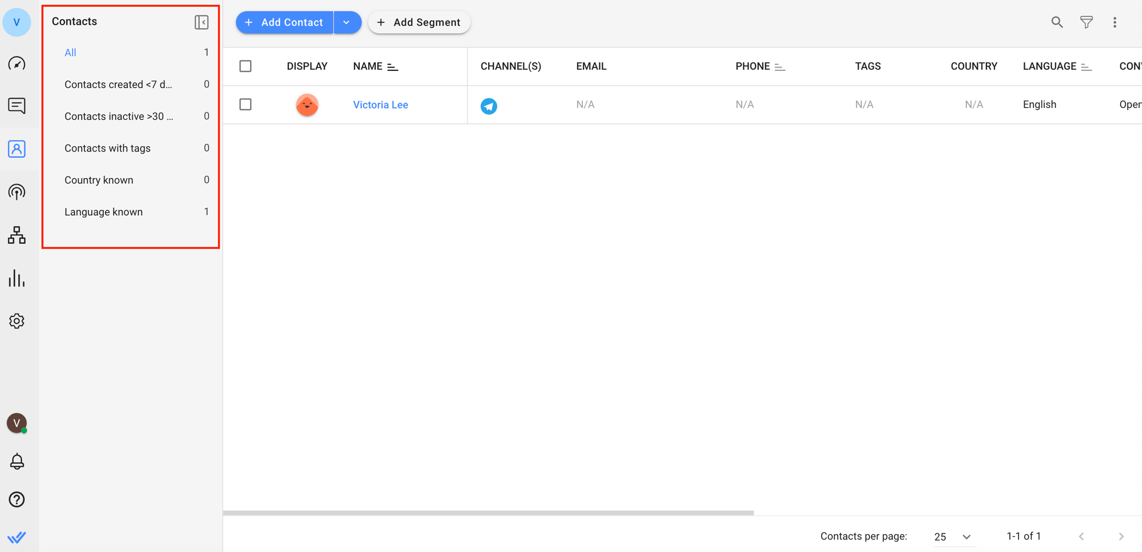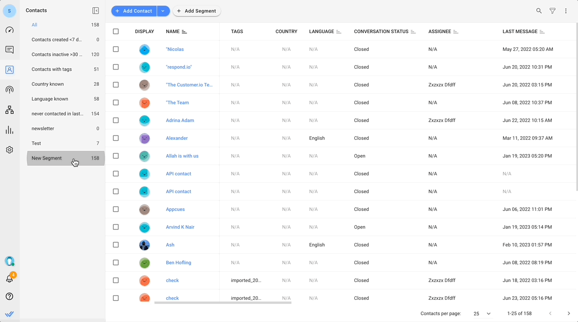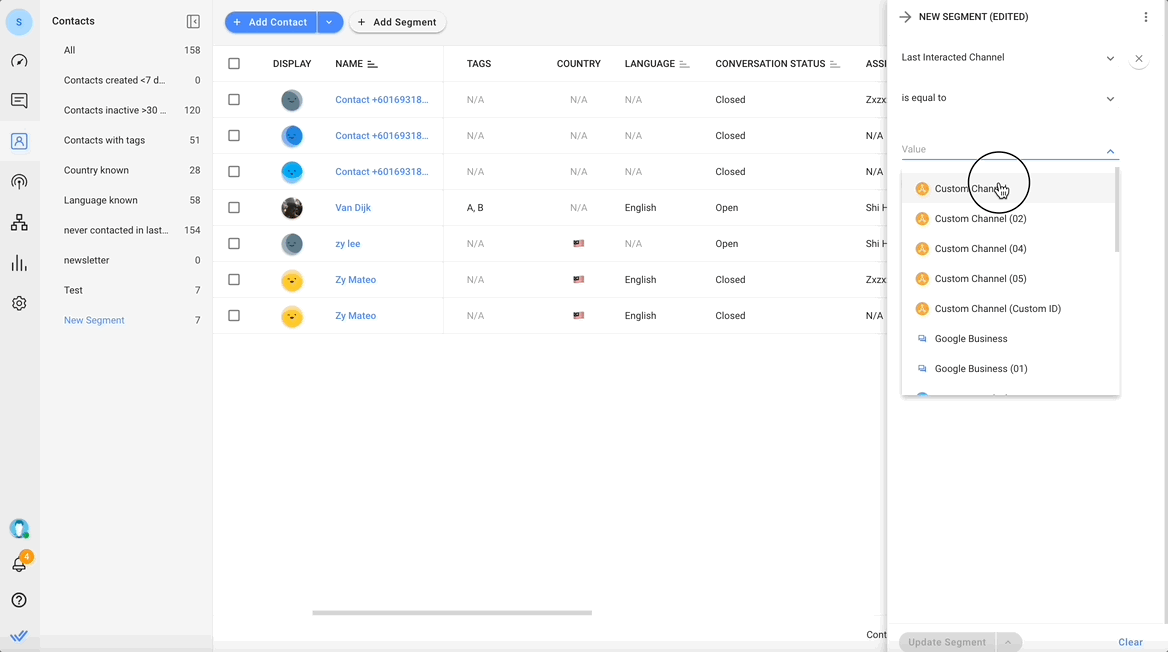 Todos los segmentos creados aparecerán a la izquierda en la lista de Segmentos. Los números al lado del nombre del segmento indican la cantidad de contactos en el segmento.