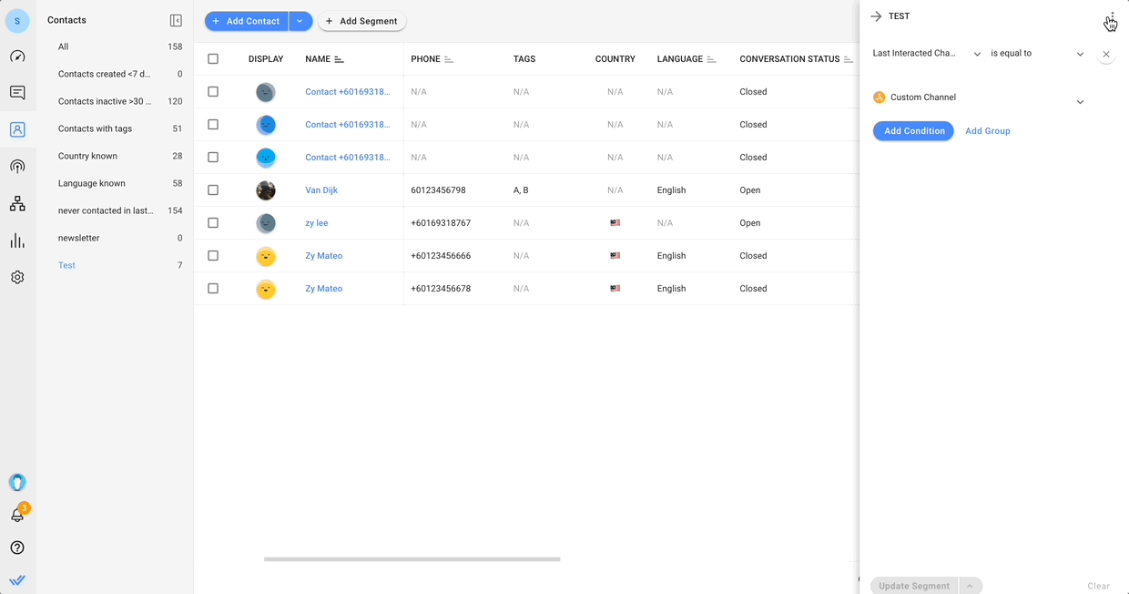 Paso 2: Agregar filtros Filtra tu segmento agregando condiciones o grupos. Utilice los campos Categoría y Operador según sus criterios. Los contactos que cumplan con los criterios aparecerán en la lista de contactos.