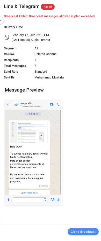 Si encuentra errores en el Registro de mensajes fallidos, verifique las limitaciones del canal por el que se envió la difusión.