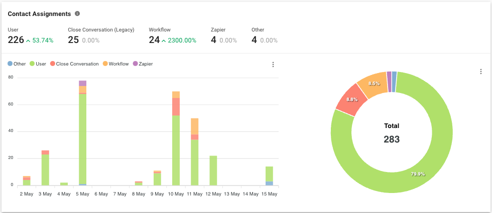 El informe Asignaciones proporciona información sobre cómo funcionan las asignaciones de contactos y si se realizan de manera efectiva en la plataforma. Puede conocer el número total de asignaciones y el número de asignaciones realizadas por origen, así como obtener información más detallada sobre cada asignación de contacto que ocurrió dentro de un período seleccionado.