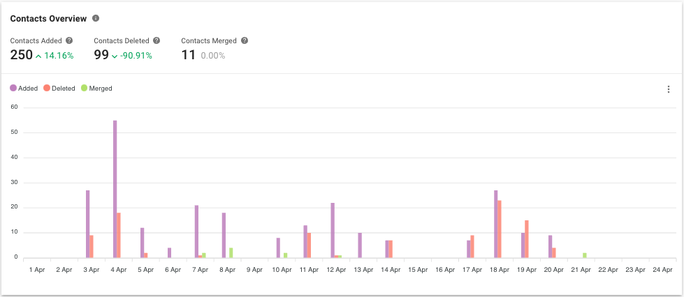Gráfico de barras: Contactos agregados o eliminados y fusionados La cantidad de contactos agregados, eliminados y fusionados dentro del período seleccionado.