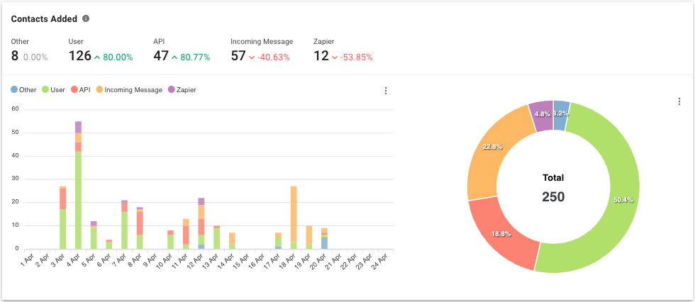 Métrica La cantidad de contactos agregados dentro del período seleccionado desglosados por fuente o cómo se agregaron los contactos.