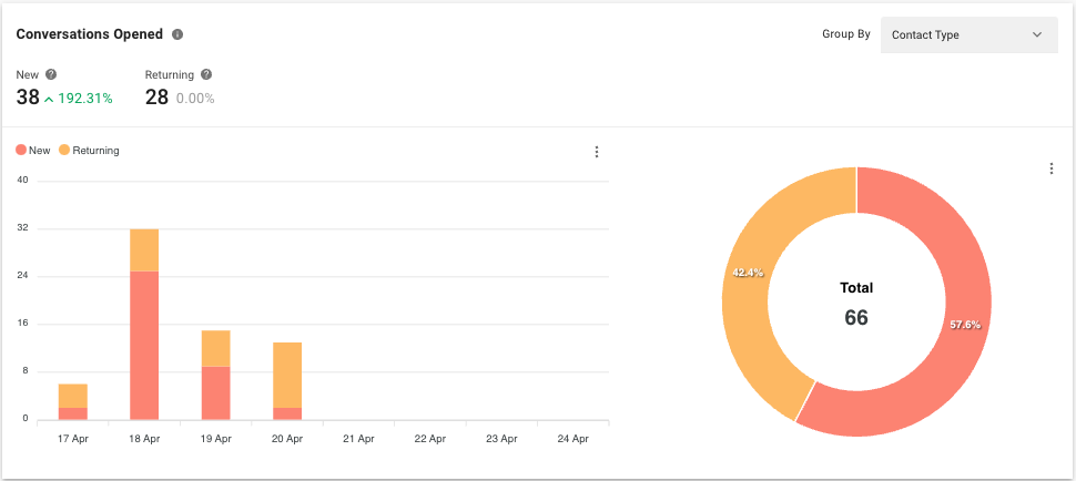 Gráfico circular: Nuevos vs Recurrentes El porcentaje y el número total de conversaciones abiertas por contactos nuevos y recurrentes dentro del período seleccionado.