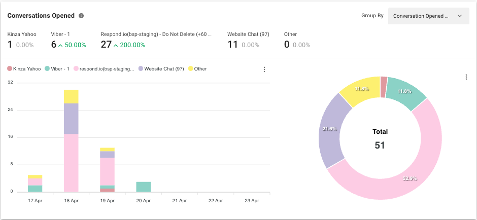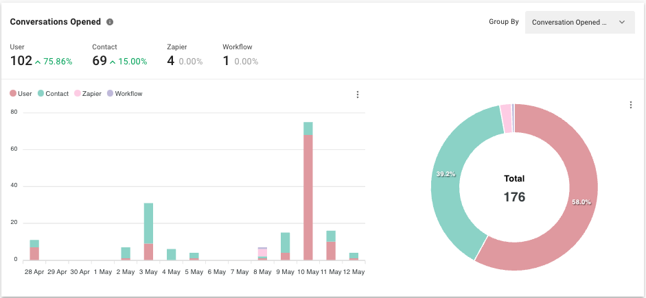 Esta descripción general muestra la cantidad y el porcentaje de conversaciones abiertas con varios desgloses de métricas dentro del período seleccionado según la marca de tiempo de apertura de la conversación.