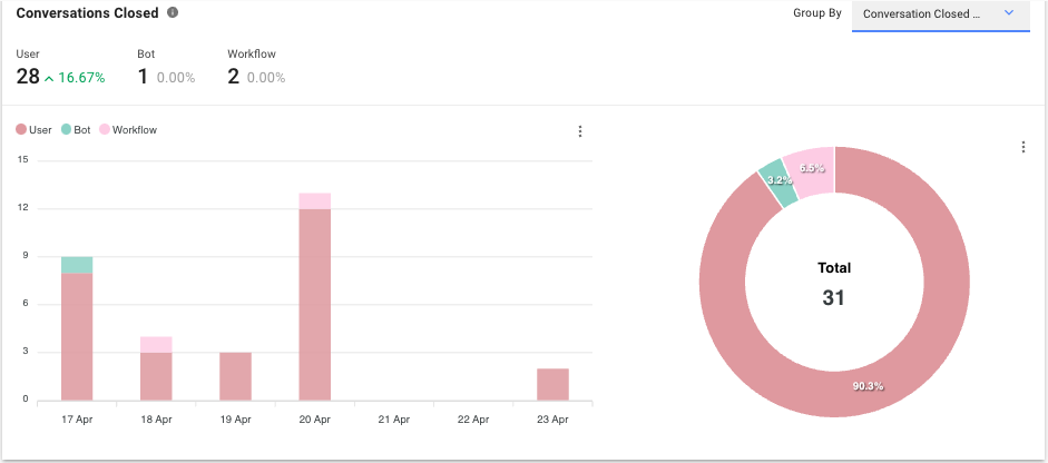 Esta descripción general muestra la cantidad y el porcentaje de conversaciones cerradas con varios desgloses de métricas dentro del rango de fechas seleccionado según la marca de tiempo de cierre de la conversación. El gráfico se puede agrupar por categoría de conversación, fuente cerrada de conversación y tipo de contacto.