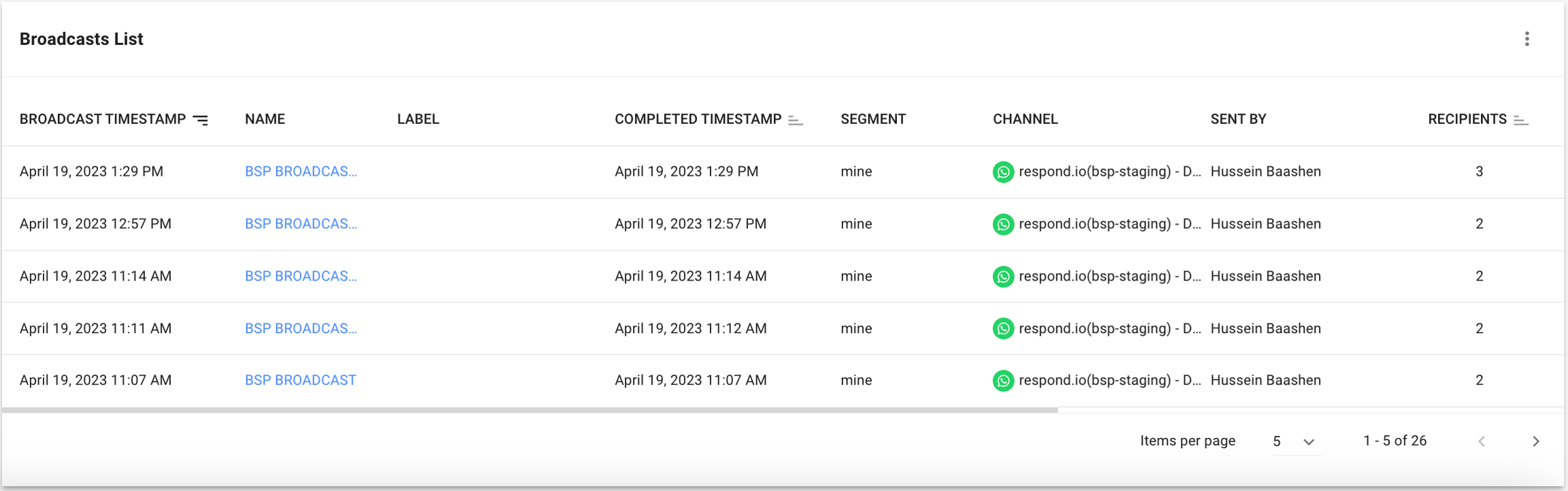 Métrica El número y porcentaje de mensajes de difusión para las difusiones que fueron enviados dentro del período seleccionado por los usuarios que enviaron las difusiones.