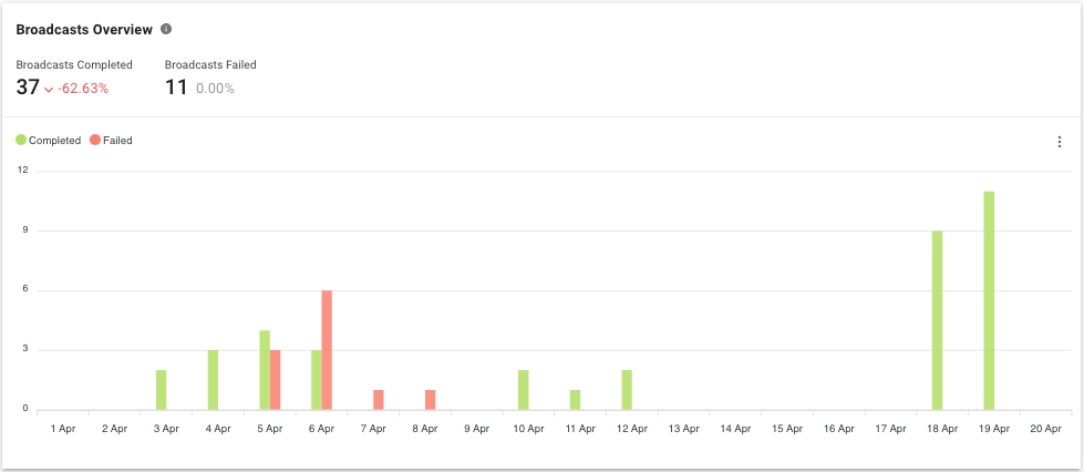 Esta descripción general muestra la cantidad de difusiones completadas y fallidas dentro del período seleccionado según el tiempo de entrega. Le ayuda a comprender el rendimiento general de las difusiones.