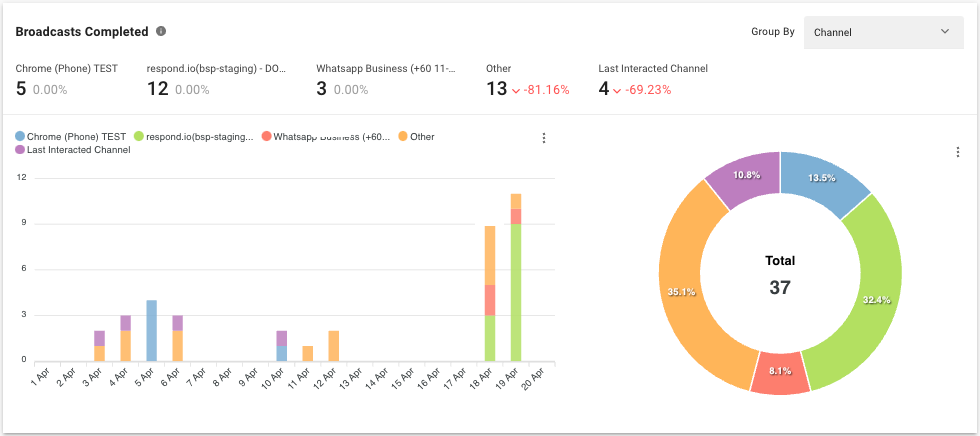 Esta descripción general muestra la cantidad y el porcentaje de difusiones completadas dentro del período seleccionado según el tiempo de entrega. El gráfico se puede agrupar por Canal o Enviado por para comprender el rendimiento de las difusiones que se envían en diferentes canales o por usuarios que enviaron las difusiones.