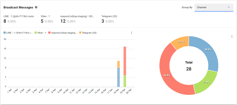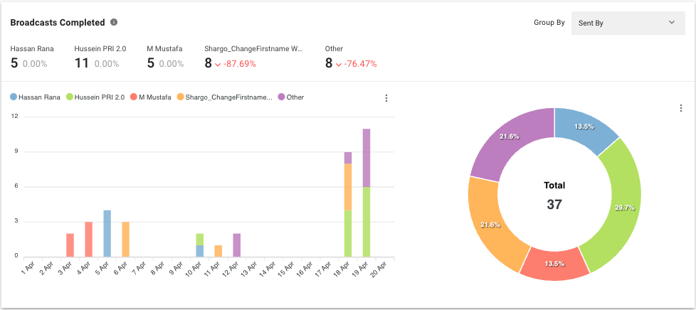 Esta descripción general muestra la cantidad y el porcentaje de mensajes de difusión para las difusiones que se enviaron dentro del período seleccionado según el tiempo de entrega. El gráfico se puede agrupar por Canal o Enviado por para analizar el rendimiento de los mensajes de difusión por diferentes canales y por usuarios que enviaron la misma.