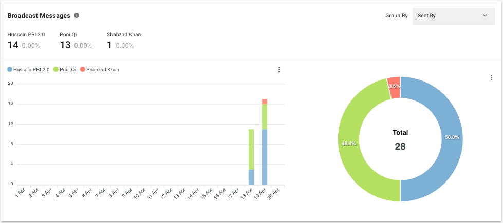 Gráfico circular El porcentaje y el número total de mensajes de difusión para las difusiones que fueron enviados dentro del período seleccionado por los usuarios que enviaron las difusiones.
