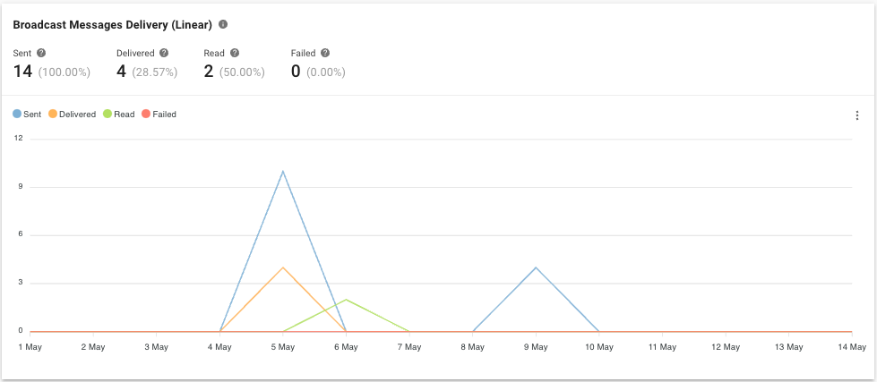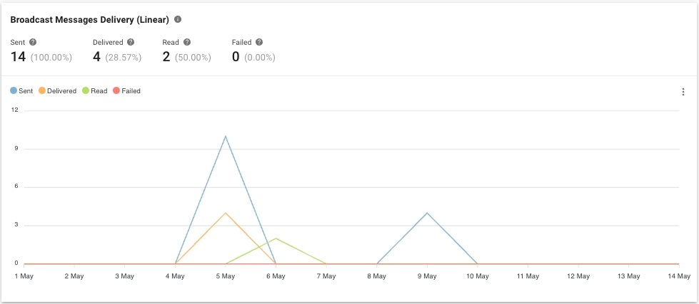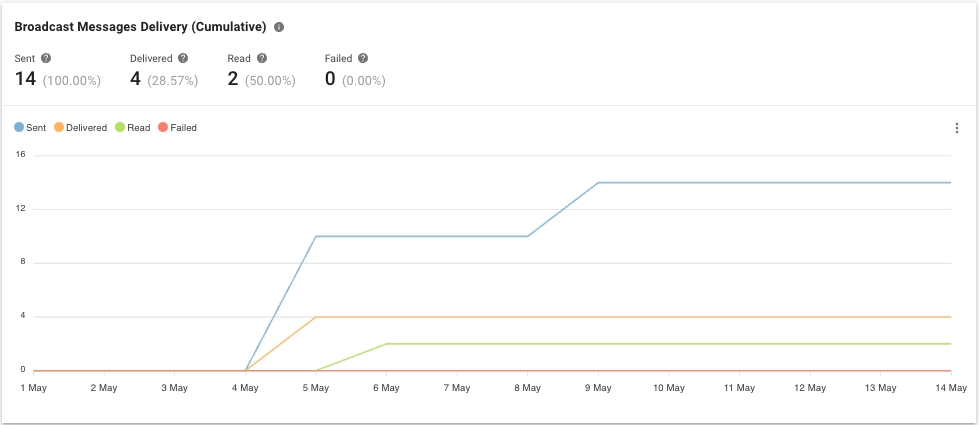 Métrica y gráfico El número de mensajes de difusión para las difusiones que se enviaron, entregaron, leyeron y fallaron dentro del período seleccionado.