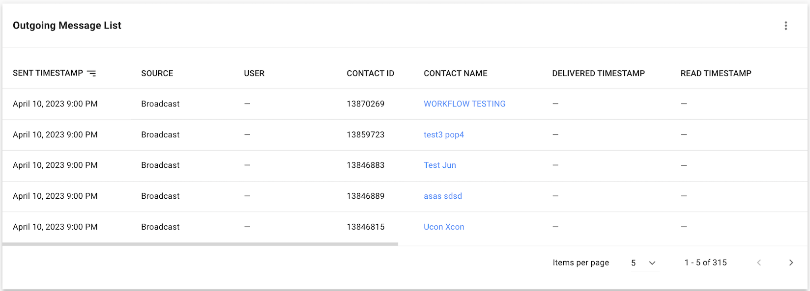 Desde esta lista, puede revisar los detalles de cada mensaje enviado a un Contacto.