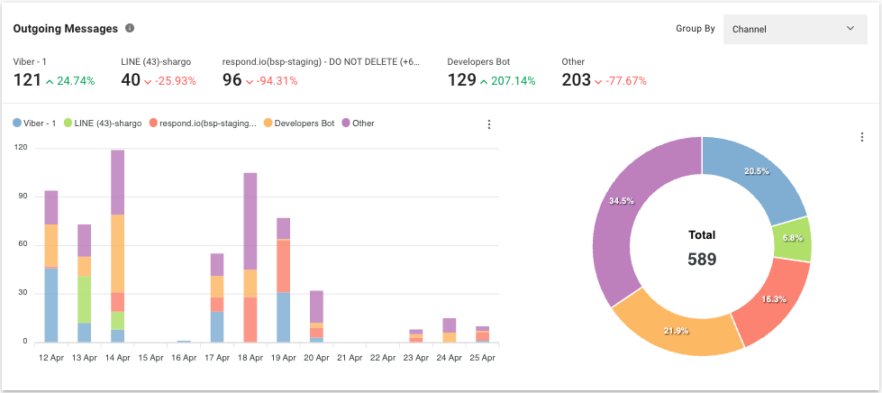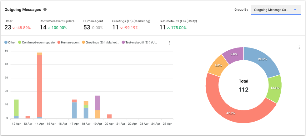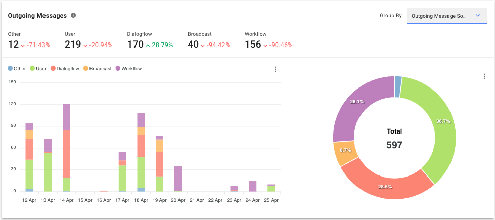 El gráfico se puede agrupar por Canal, Origen del mensaje saliente, Tipo de mensaje saliente y Subtipo de mensaje saliente.