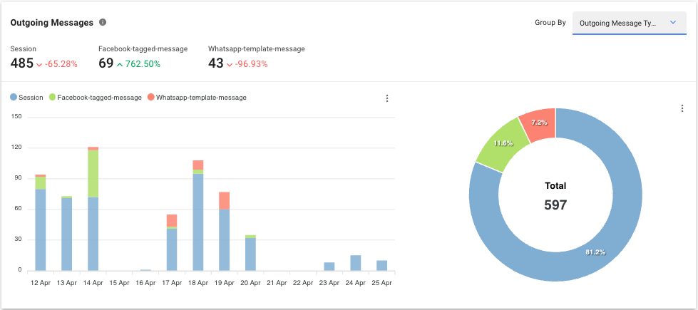 Métrica La cantidad de mensajes enviados dentro del período seleccionado por subtipo. El subtipo solo se aplica al canal de Facebook cuando se envía una etiqueta de mensaje y al canal de WhatsApp cuando se envía una plantilla de mensaje de WhatsApp.