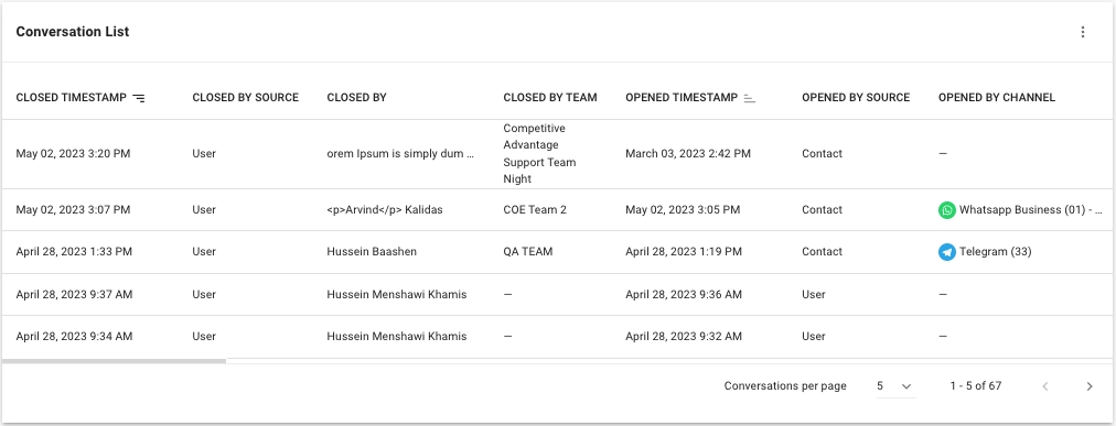 Esta tabla muestra un desglose de las conversaciones que se cierran dentro del período seleccionado según la última asignación para cerrar la hora de las conversaciones.