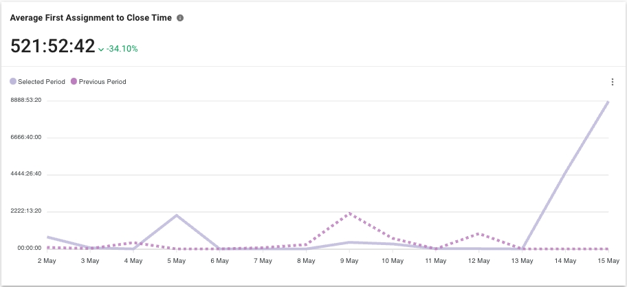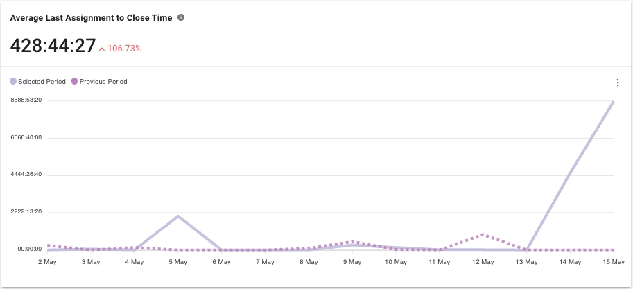 Métrica La cantidad de tiempo promedio que se tarda en cerrar una conversación desde que se asignó la conversación al último usuario. También llamada Tiempo de resolución basado en la última asignación, esta métrica ayuda a los gerentes a analizar el tiempo promedio de resolución de la conversación desde que se asignó el último agente y excluye el tiempo de la reasignación anterior.