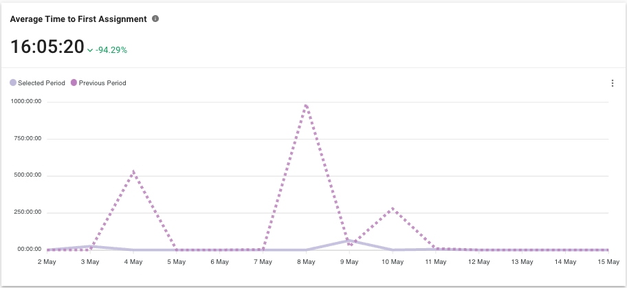 Gráfico de líneas Compara el tiempo promedio necesario para asignar una conversación al primer usuario durante el período seleccionado con los datos del período anterior.