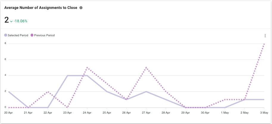 Gráfico de líneas Compara el número promedio de asignaciones que ocurrieron hasta que se cerró la conversación para el período seleccionado con datos del período anterior.