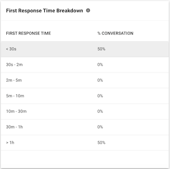 Esta tabla muestra el desglose de las conversaciones que se cierran dentro del período seleccionado por el tiempo de primera respuesta de las conversaciones.