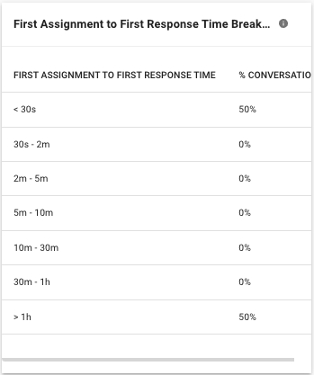 Esta tabla muestra el desglose de las conversaciones que se cierran dentro del período seleccionado por la primera asignación al primer tiempo de respuesta de las conversaciones.