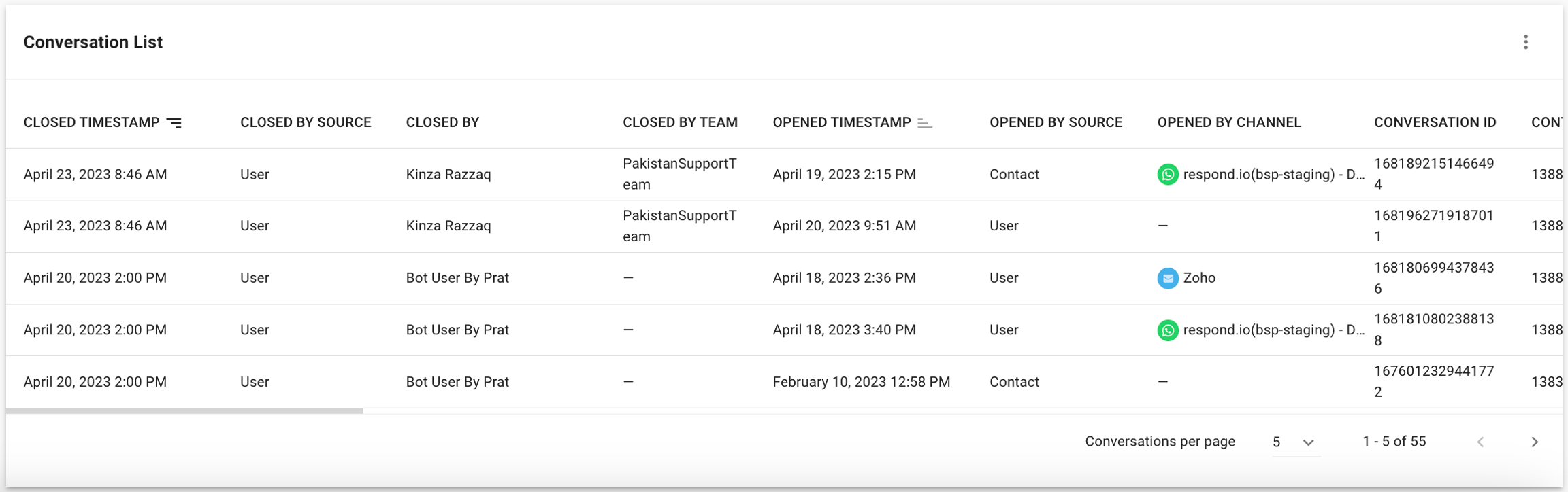 El canal desde donde se abrió la conversación. Si la conversación se abre manualmente haciendo clic en el botón “Abrir conversación”, se mostrará como “-”.