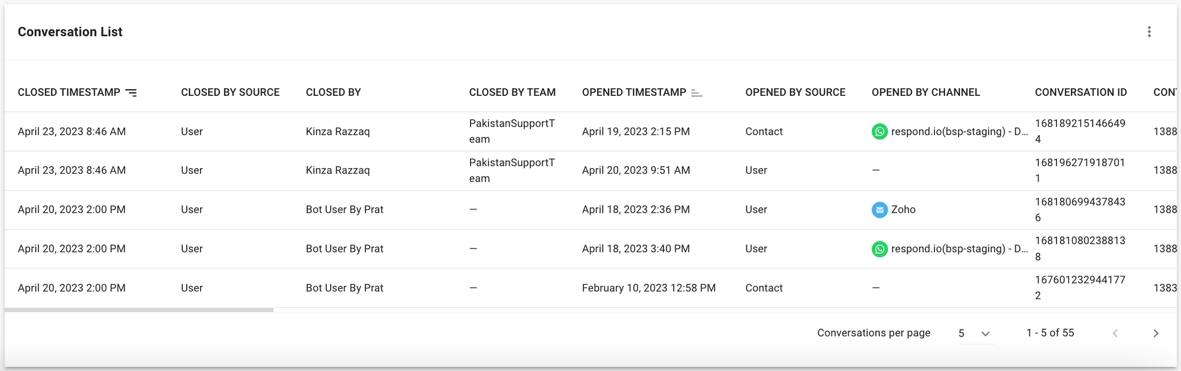 Esta tabla muestra el desglose de las conversaciones que se cierran dentro del período seleccionado por respuestas de la conversación.