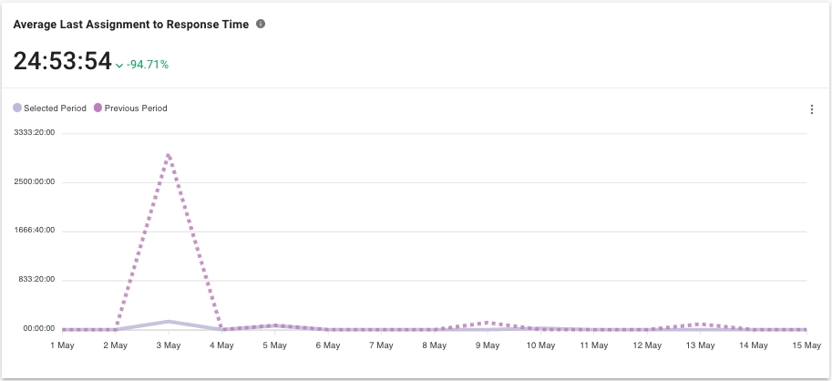 Gráfico de líneas Compara el tiempo promedio de primera respuesta basado en la última asignación para el período seleccionado con datos del período anterior.