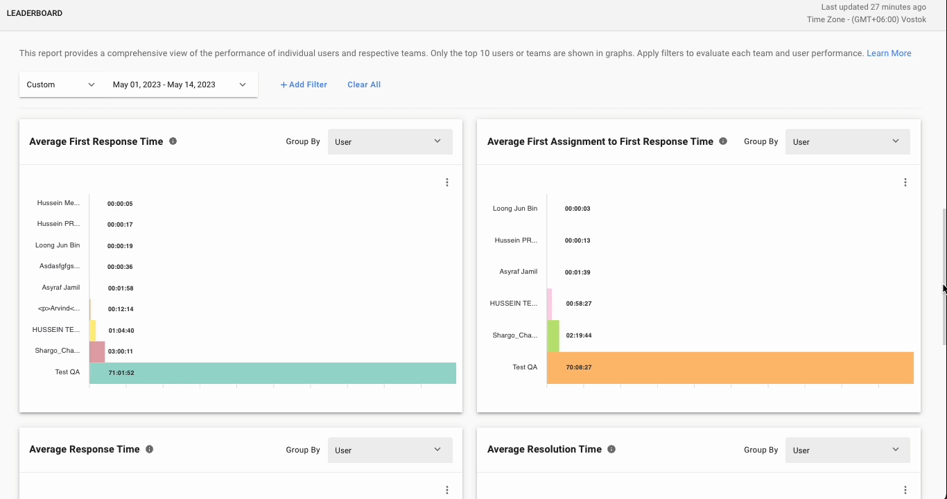 Los siguientes gráficos comparan el desempeño de los usuarios o equipos en métricas relacionadas con el tiempo de respuesta y resolución. Utilice el menú desplegable en la parte superior derecha de cada gráfico para cambiar entre vistas de grupo por usuario y grupo por equipo.